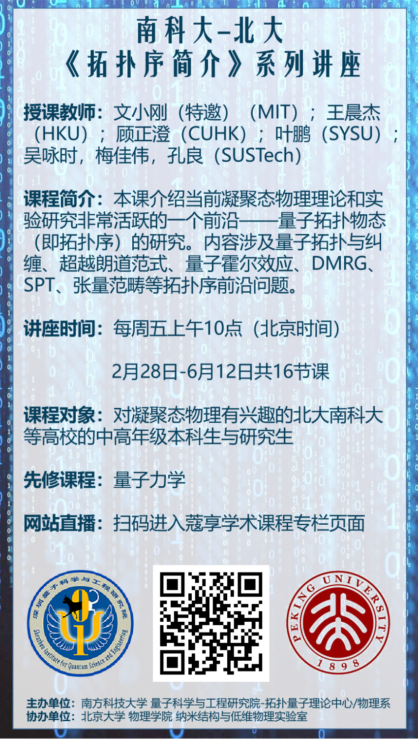 本网课由南方科技大学量子科学与工程研究院拓扑量子理论中心承办,并邀请粤港及美国专家学者客串演讲。面向有志于凝聚态物理研究的本科生和低年级研究生的一门通选课或专业选修课。