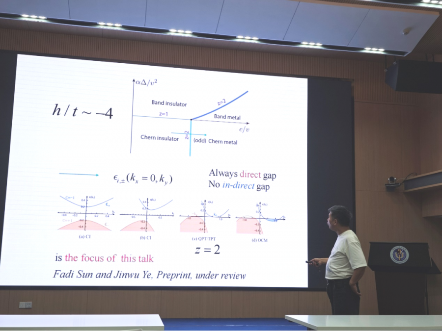 叶锦武教授首先介绍了一个简单的量子反常霍尔效应/Chern绝缘体模型。这一模型的拓扑性质可通过调节参数来调节。在此基础上,叶锦武教授给系统引入了破坏了宇称对称性的外电流,并通过调节电流项的强度,Chern绝缘体可以变为Chern金属,而普通绝缘体则可变为普通金属态。