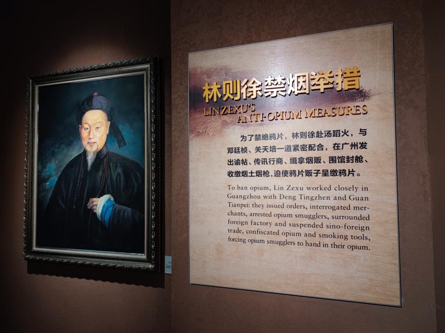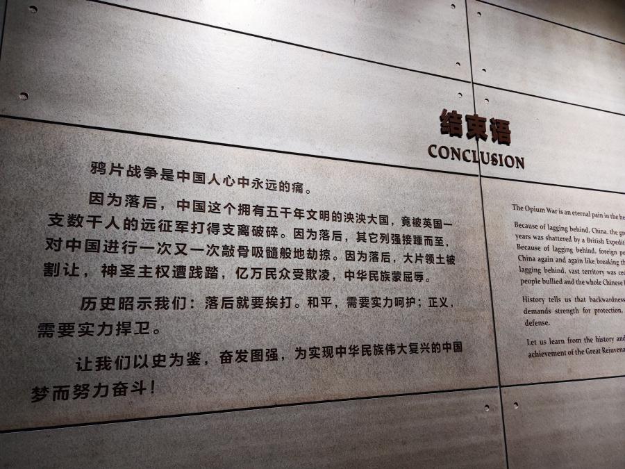 “鸦片战争是中国人心中永远的痛。因为落后,中国这个拥有五千年文明的泱泱大国,竟被英国一支数千人的远征军打的支离破碎。因为落后,其它列强接踵而至,对中国进行一次又一次敲骨吸髓般地劫掠。因为落后,大片领土被割让,神圣主权遭践踏,亿万民众受欺凌,中华民族蒙屈辱。历史昭示我们:落后就要挨打。和平,需要实力呵护;正义,需要实力捍卫。让我们以史为鉴,奋发图强,为实现中华民族伟大复兴的中国梦而努力奋斗!”