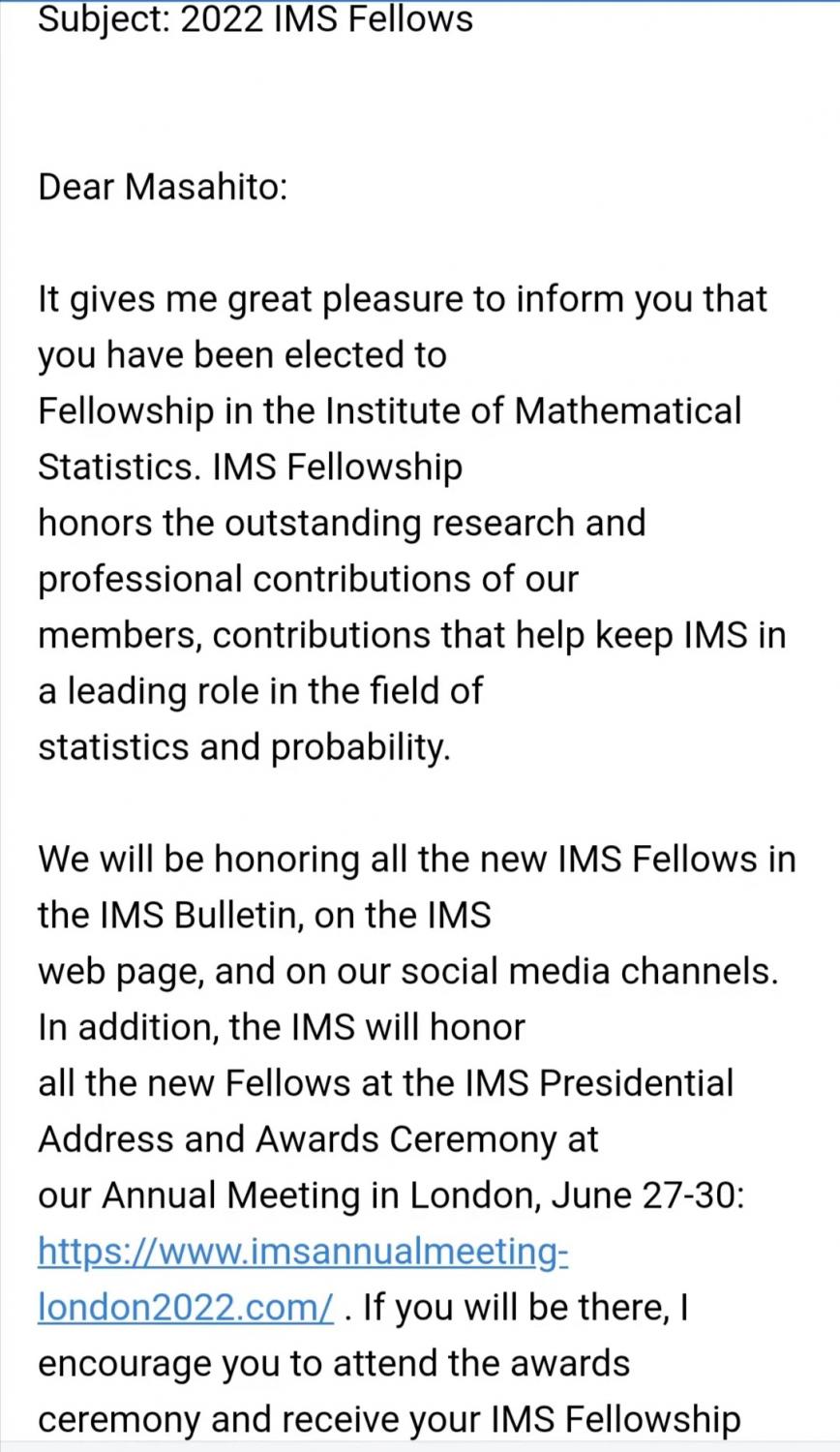 国际数学统计学会将会于2022年6月27至28日在伦敦召开会议并举办颁奖仪式,授予新当选人员会士并颁发荣誉证书。这是Masahito教授继获得IEEE Fellow之后又一次获得的国际学术机构的重要头衔!热烈祝贺!