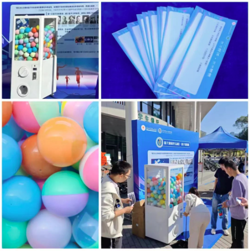 量子研究院结合量子发展史、量子科技前沿进展等设计了一款“量子扭蛋机”,吸引了众多师生前来互动。“物理学的四大神兽是什么?”、“能量量子化提出者、量子版本的‘陈独秀’是谁?”,一系列精彩的问题在寓教于乐的同时为师生普及了量子知识。