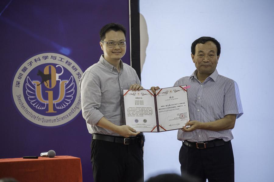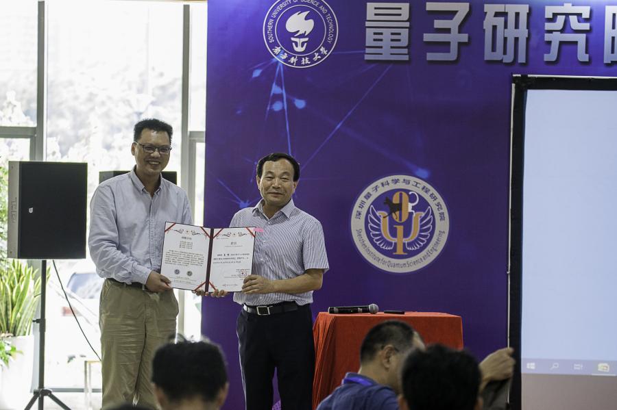 图为俞大鹏院士为量子算法与软件中心负责人 翁文康颁发聘书 图为俞大鹏院士为量子材料研究所负责人 夏钶办法聘书